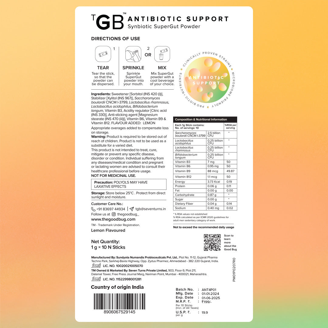 Saccharomyces boulardii prevents and reduces diarrhea by binding pathogens, supporting the immune system, and maintaining the gut bacteria.Lactobacillus and Bifidobacterium strains colonize the gut outcompete harmful pathogens for nutrients thereby maintaining beneficial bacteria balance, mitigating antibiotics' negative impact.B Vitamins (B12, B3, B9, B6) enhance digestive health and energy metabolism, supporting gut resilience.