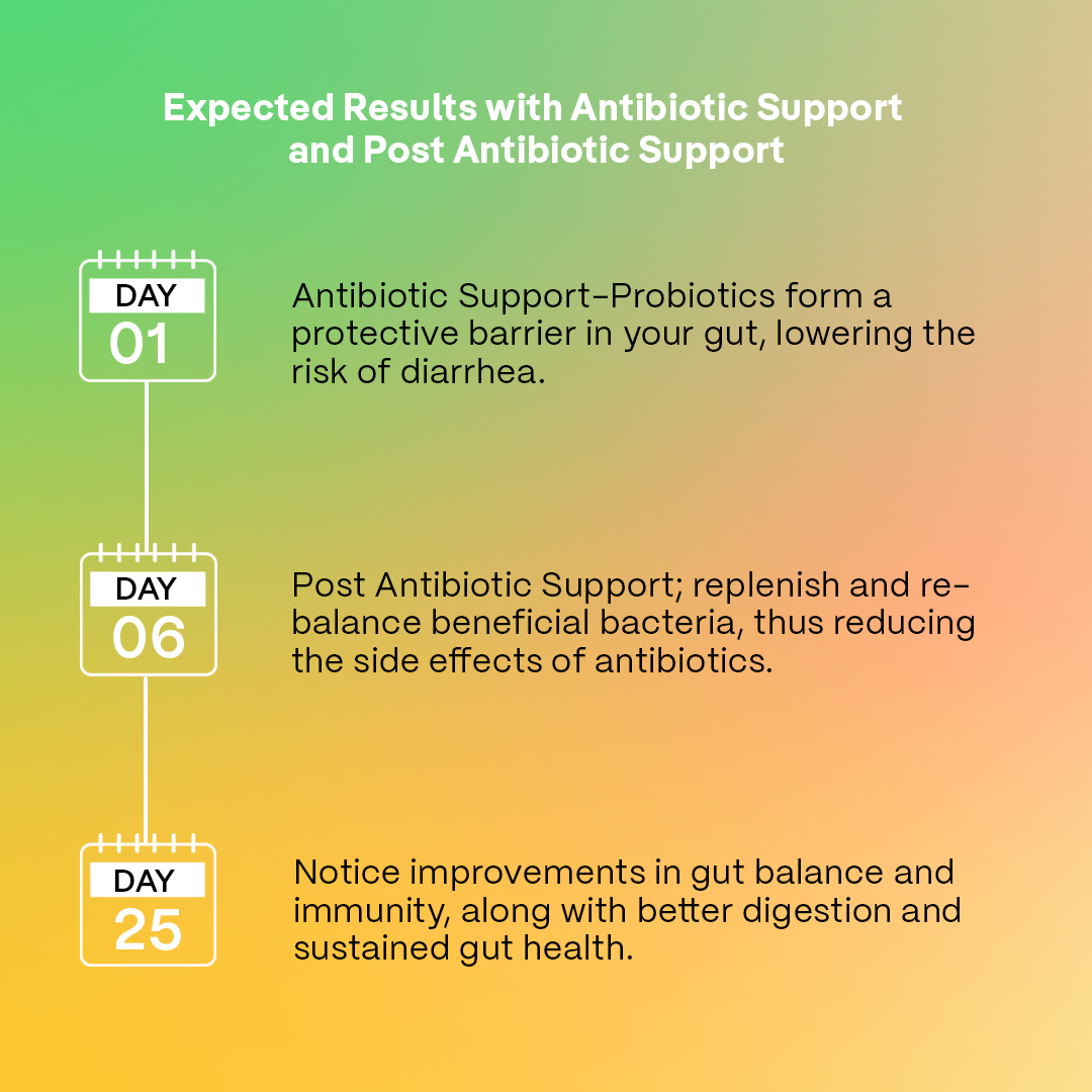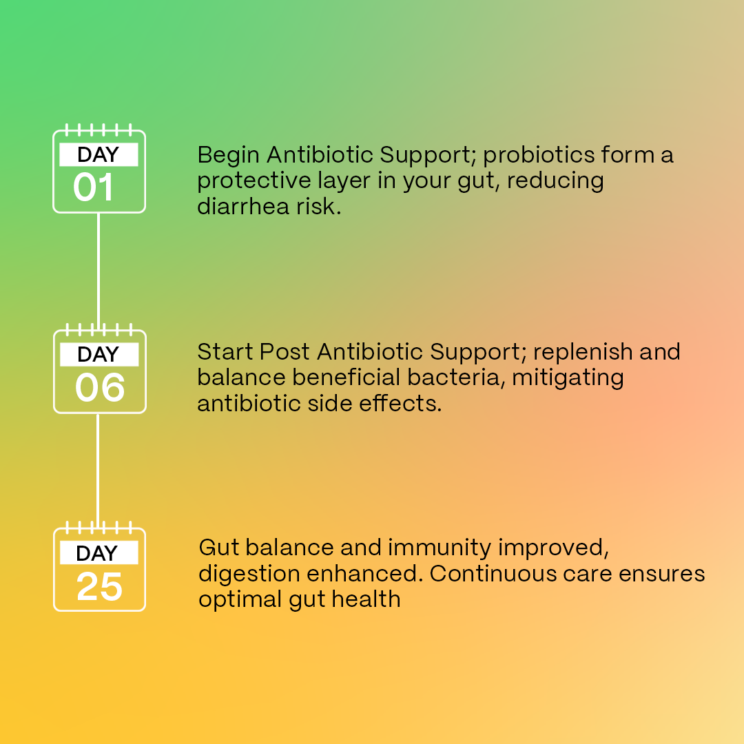 Begin Antibiotic Support on the first day of your antibiotic treatment. After completing the antibiotic course, immediately switch to Post Antibiotic Support to continue supporting your gut health.
