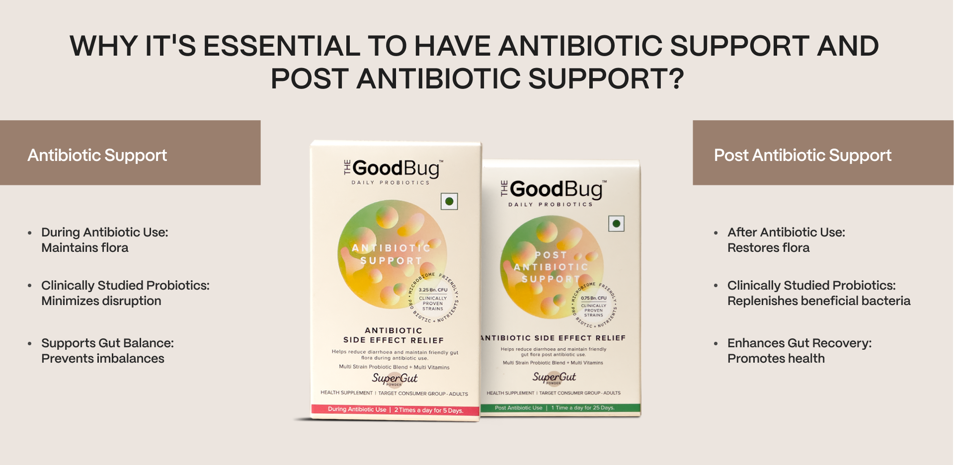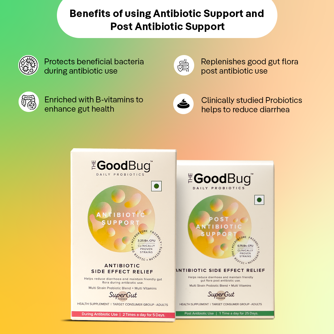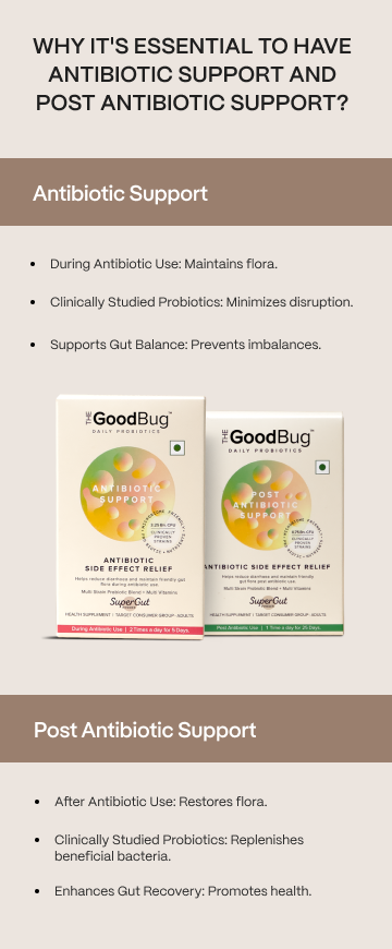 The Antibiotic Support and Post Antibiotic Support probiotics work synergistically to protect and restore gut health during and after antibiotic treatment: