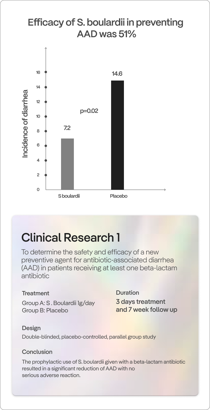Helps maintain gut health during antibiotic treatment by blocking harmful pathogens from colonizing the gastrointestinal tract, supporting a balanced microbial environment.