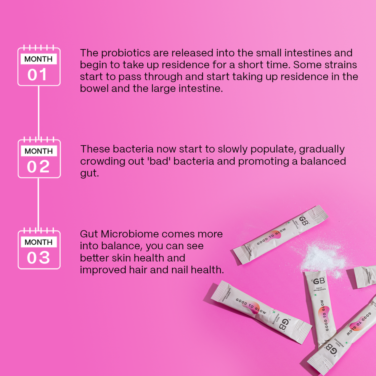 Further, The probiotics in Good to Glow promote healthy skin, hair and nails by boosting collagen production, reducing inflammation and oxidative stress, resulting in smoother, more hydrated, and younger-looking skin and stronger hair and nails.