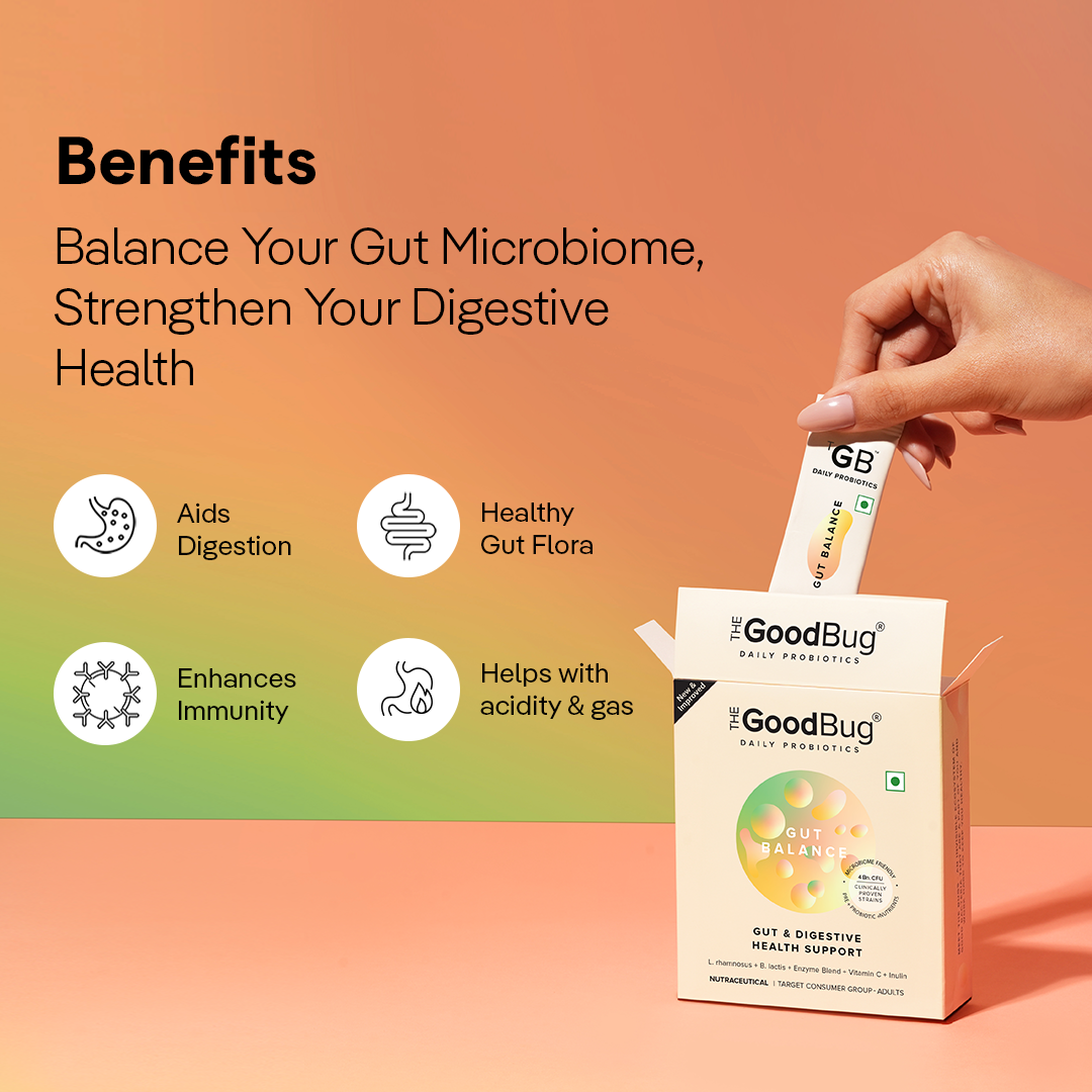 Disbalance in gut microbiome is the root cause for these symptoms. Our synbiotic formula with clinically proven strains, Gut Balance SuperGut stick will help restore that lost balance, correct overall gut health and aid in better nutrient absorption.