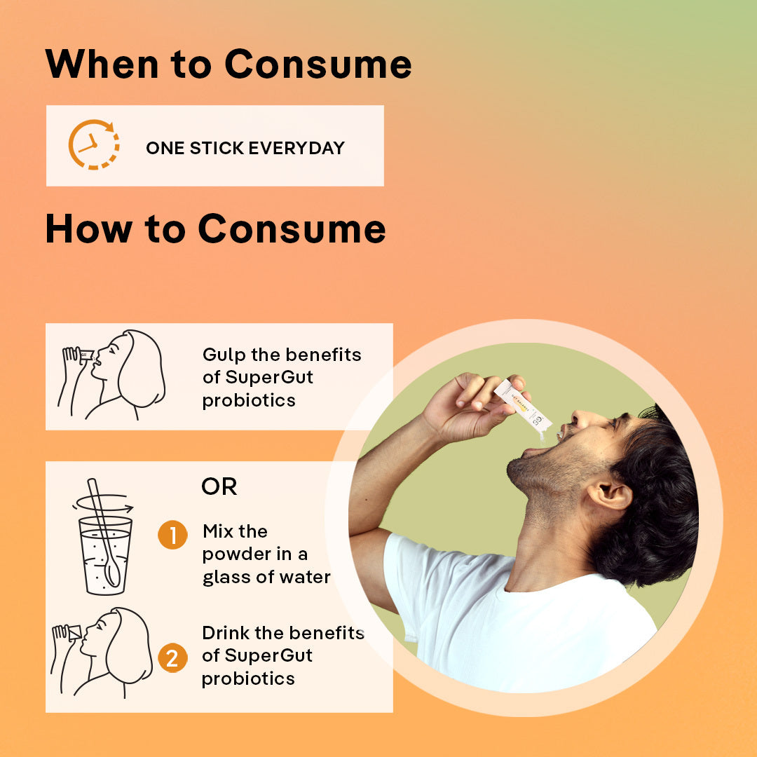 For best results, mix the sachet with 200ml of water. Avoid mixing it with carbonated or aerated beverages like soda, as this could affect the effectiveness of the probiotics.