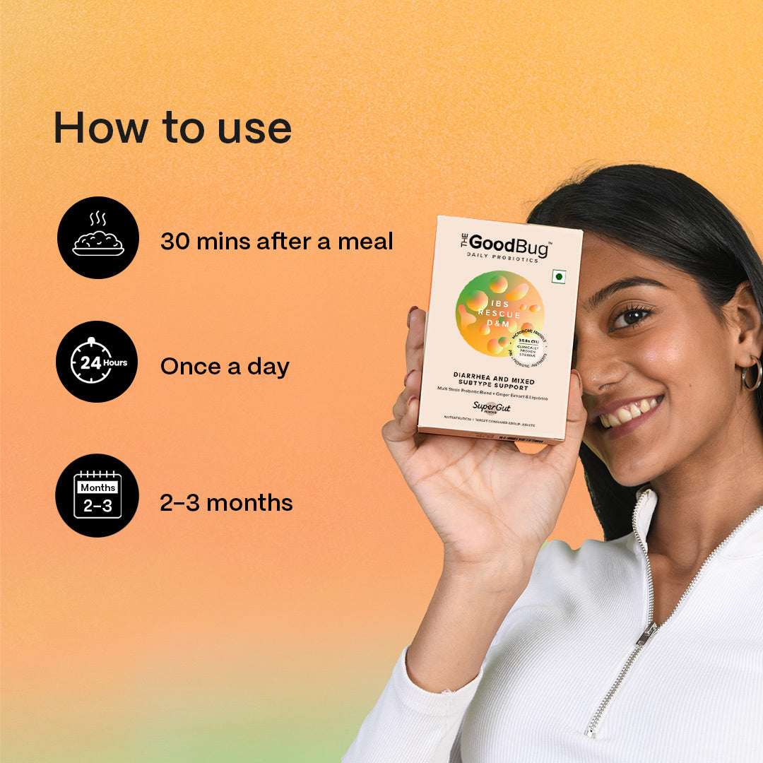 In addition to the medications. IBS also requires nutrition support in the form of Probiotics and other nutrients. The supergut powder works best when accompanied by a healthy diet and lifestyle choices. Here are some reminders: