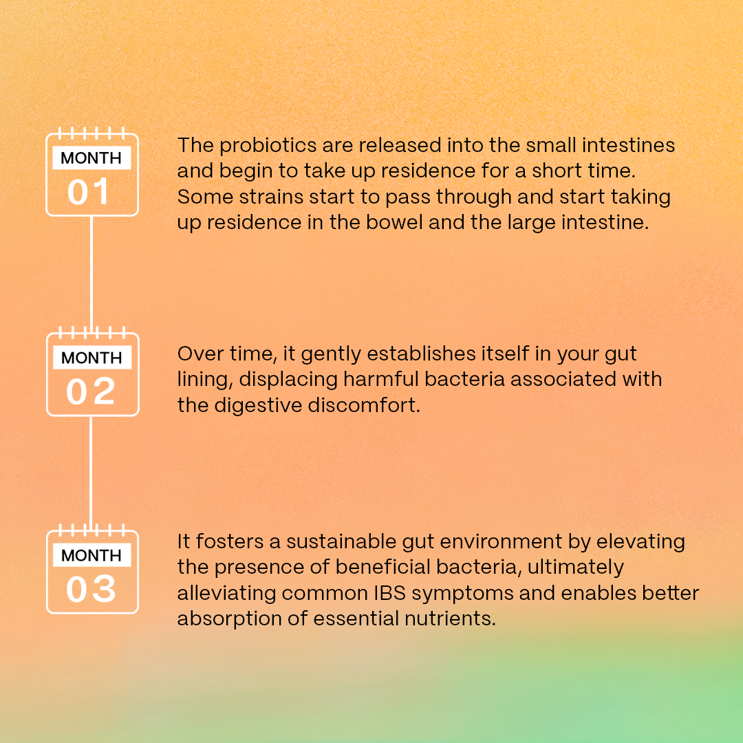 Results may differ from person to person, with some individuals experiencing improvements in symptoms levels within a few weeks, while it may take longer for others. It generally takes up to three months to observe changes in your microbiome and IBS severity. Consistency in use is crucial for optimal results.