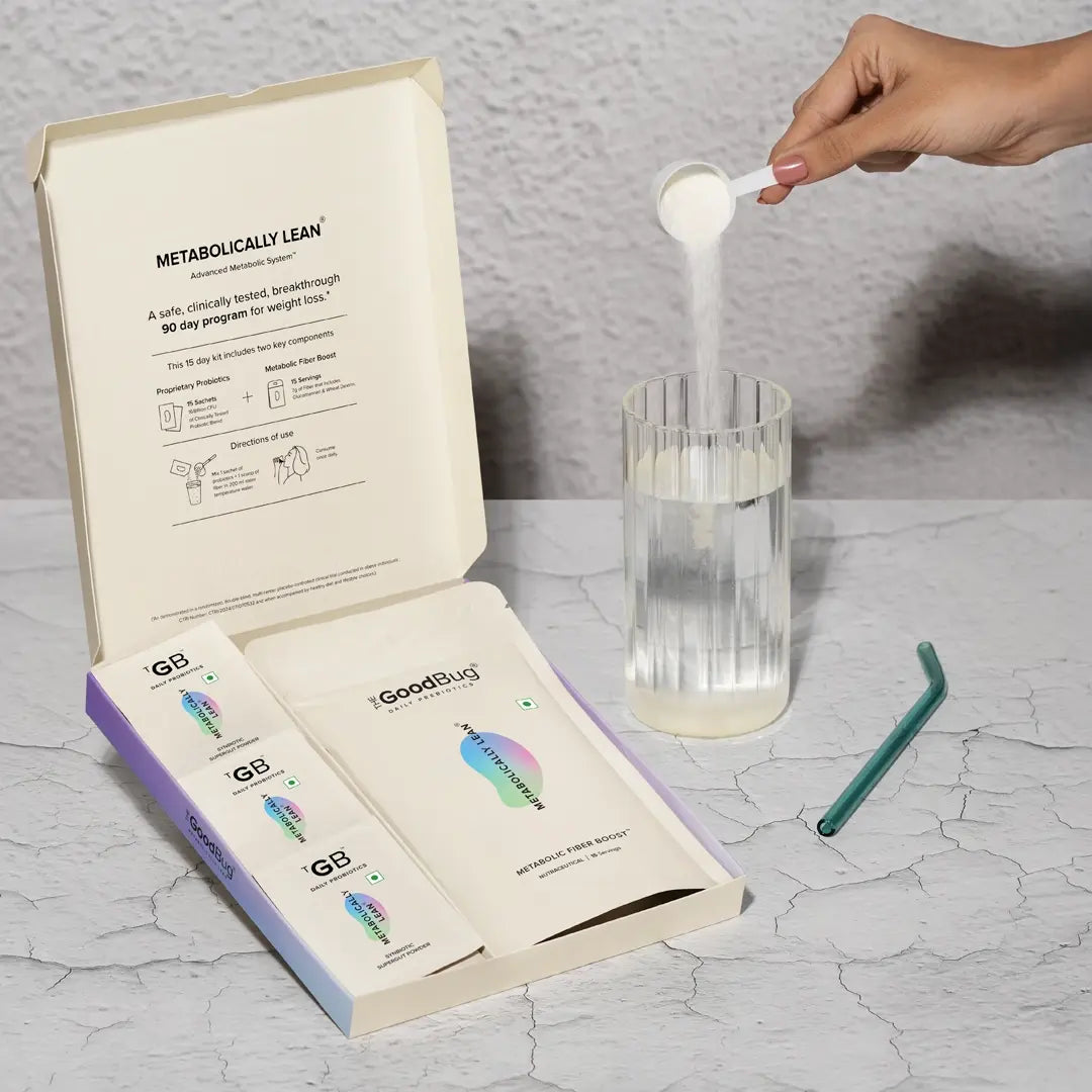 Proprietary Probiotics-L–Carnitine Tartrate, Fructooligosaccharide, Inulin, Bifidobacterium lactis, Bifidobacterium breve, Bifidobacterium bifidum, Bifidobacterium longum, Lactobacillus gasseri, Limosilactobacillus reuteri, Nature identical flavour (Lemon), Acidity Regulator (INS 330), Sweetener (INS 960), Glidant (INS 470(iii)),Chromium picolinate