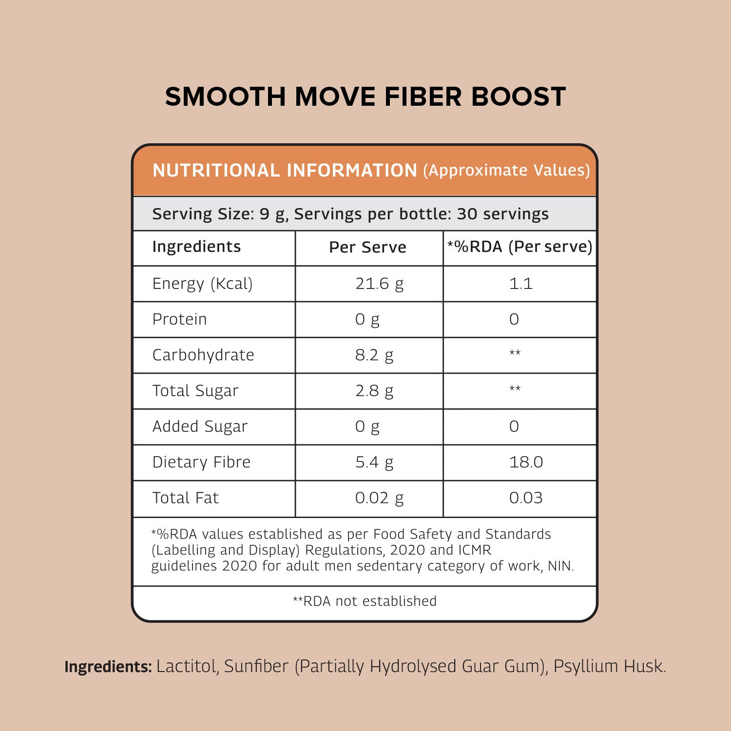Smooth Move Probiotic: Inulin, Sweetener [Mannitol (INS 421) & Sorbitol (INS 420 (i))), Glazing Agent [Polyethylene Glycol (INS 1521)], Magnesium gluconate, Acidity Regulator (Citric Acid (INS 330)], Bifidobacterium lactis, Sweetener [Steviol glycoside (INS 960)], Anti-Sticking Agent [Magnesium Stearate (INS 470 (iii))).Smooth Move Fiber Boost:Lactitol, Partially Hydrolysed Guar Gum, Psyllium Husk