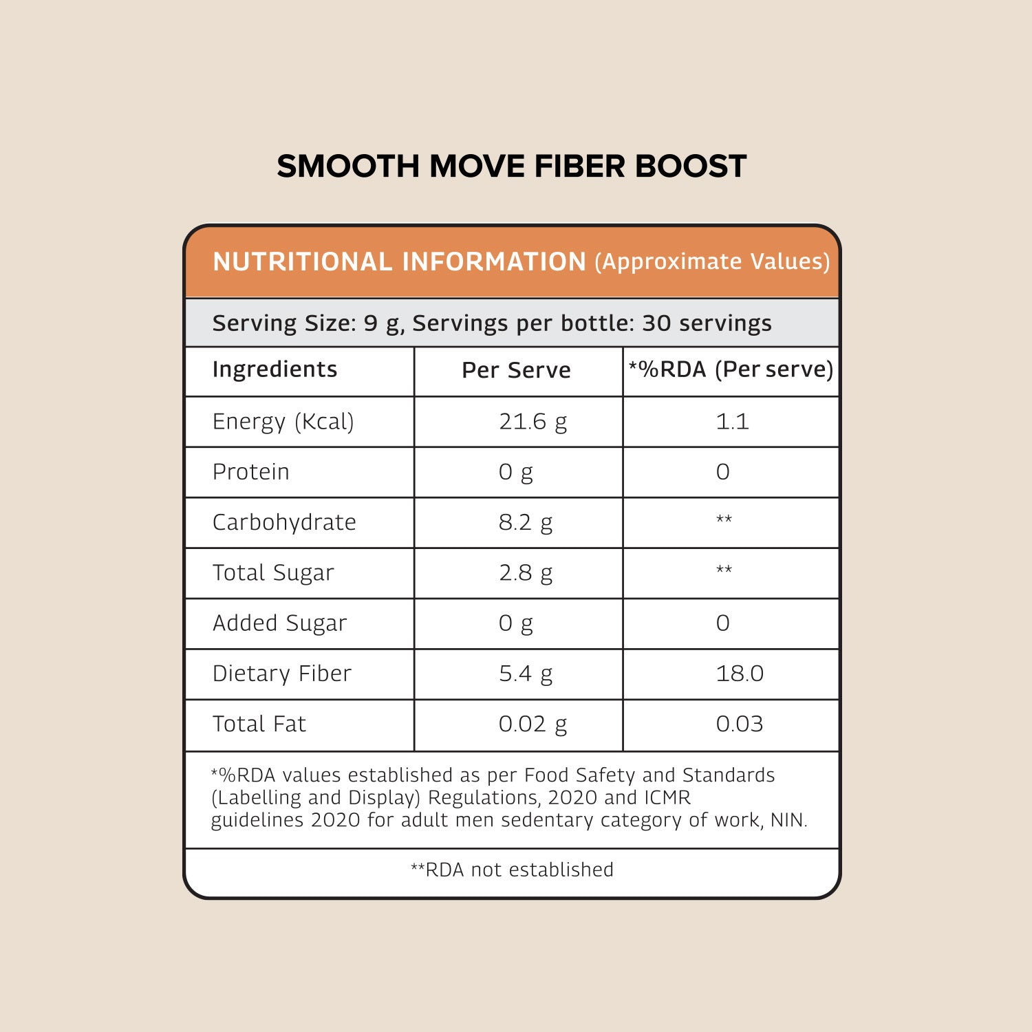 Start with half a scoop of Smooth Move Fiber Boost and 1 sachet of Smooth Move Probiotic sachet dissolved in 200 ml of water daily for the first 5 days. Then, increase the dosage of the fiber to one full scoop per day. For best results use daily.