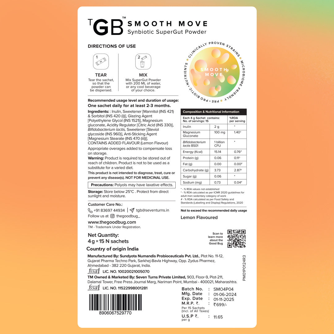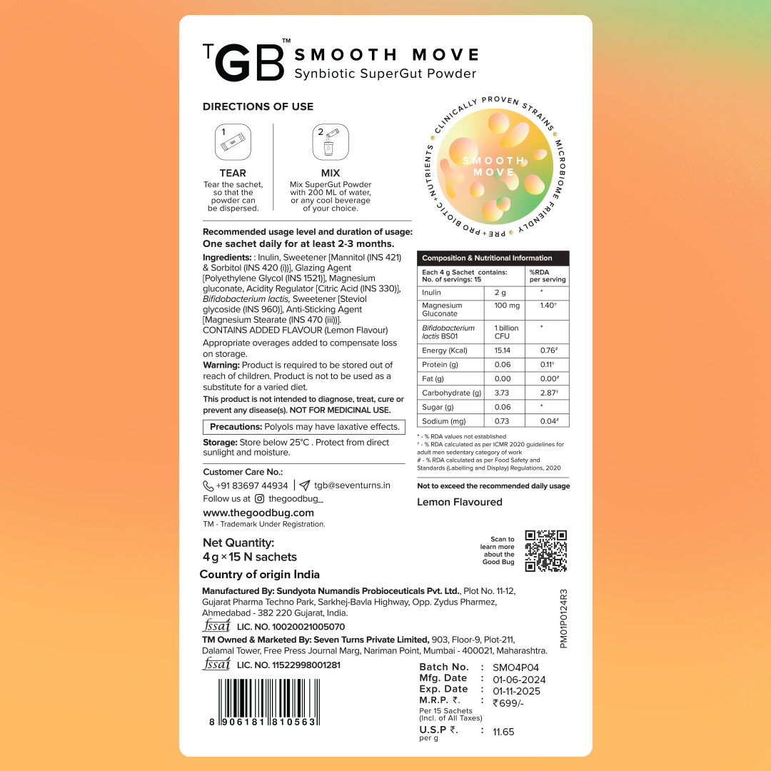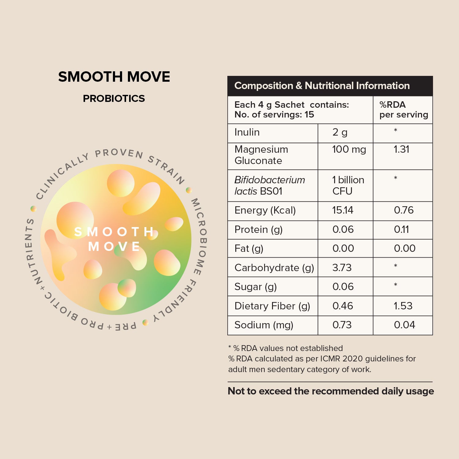 Smooth Move Probiotic: Inulin, Sweetener [Mannitol (INS 421) & Sorbitol (INS 420 (i))), Glazing Agent [Polyethylene Glycol (INS 1521)], Magnesium gluconate, Acidity Regulator (Citric Acid (INS 330)], Bifidobacterium lactis, Sweetener [Steviol glycoside (INS 960)], Anti-Sticking Agent [Magnesium Stearate (INS 470 (iii))).Smooth Move Fiber Boost:Lactitol, Partially Hydrolysed Guar Gum, Psyllium Husk