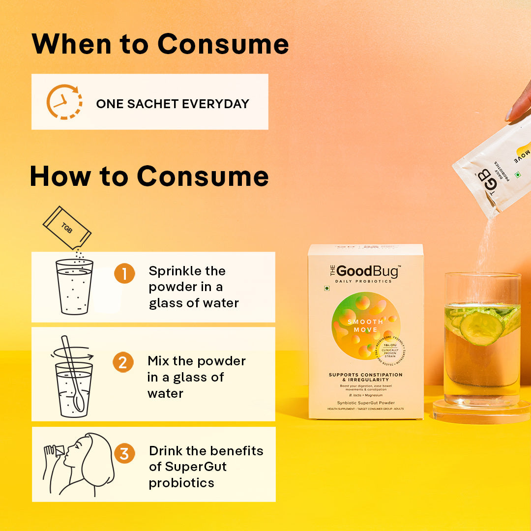 Disbalance in gut microbiome is the root cause of these symptoms. Our synbiotic formula with clinically proven strains, Smooth Move SuperGut stick will help restore that lost balance, correct overall gut health and aid in constipation relief.