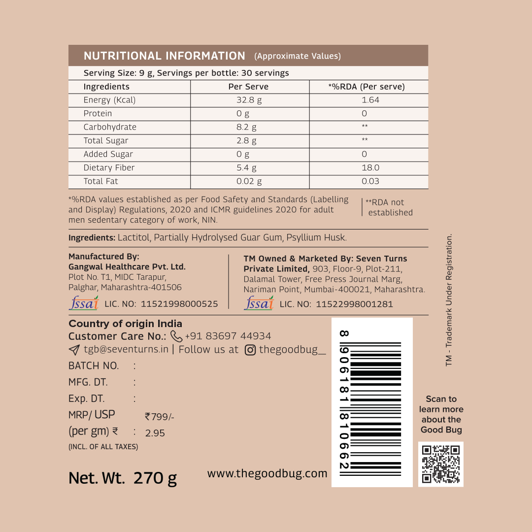 Inulin, Sweetener [Mannitol (INS 421) & Sorbitol (INS 420 (i))), Glazing Agent [Polyethylene Glycol (INS 1521)], Magnesium gluconate, Acidity Regulator (Citric Acid (INS 330)], Bifidobacterium lactis, Sweetener [Steviol glycoside (INS 960)], Anti-Sticking Agent [Magnesium Stearate (INS 470 (iii))).