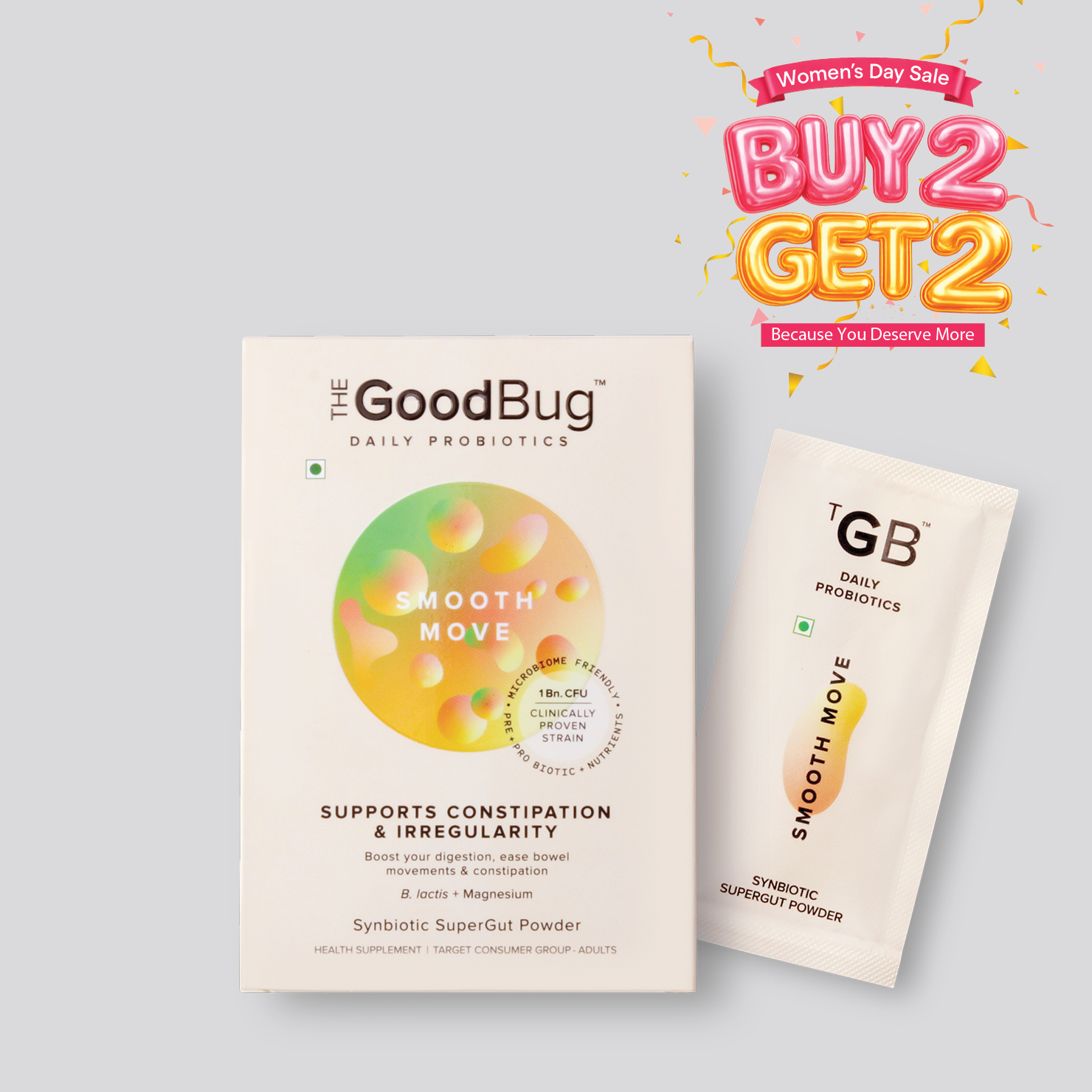 The Good Bug’s Smooth Move should make it more comfortable to pass stool. The probiotics, fibres, and magnesium gluconate together alleviate constipation, make your stool soft, and relax your bowel muscles to make passing stool easier.